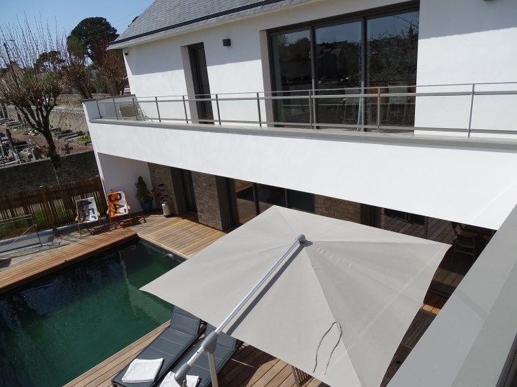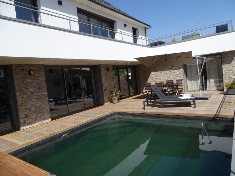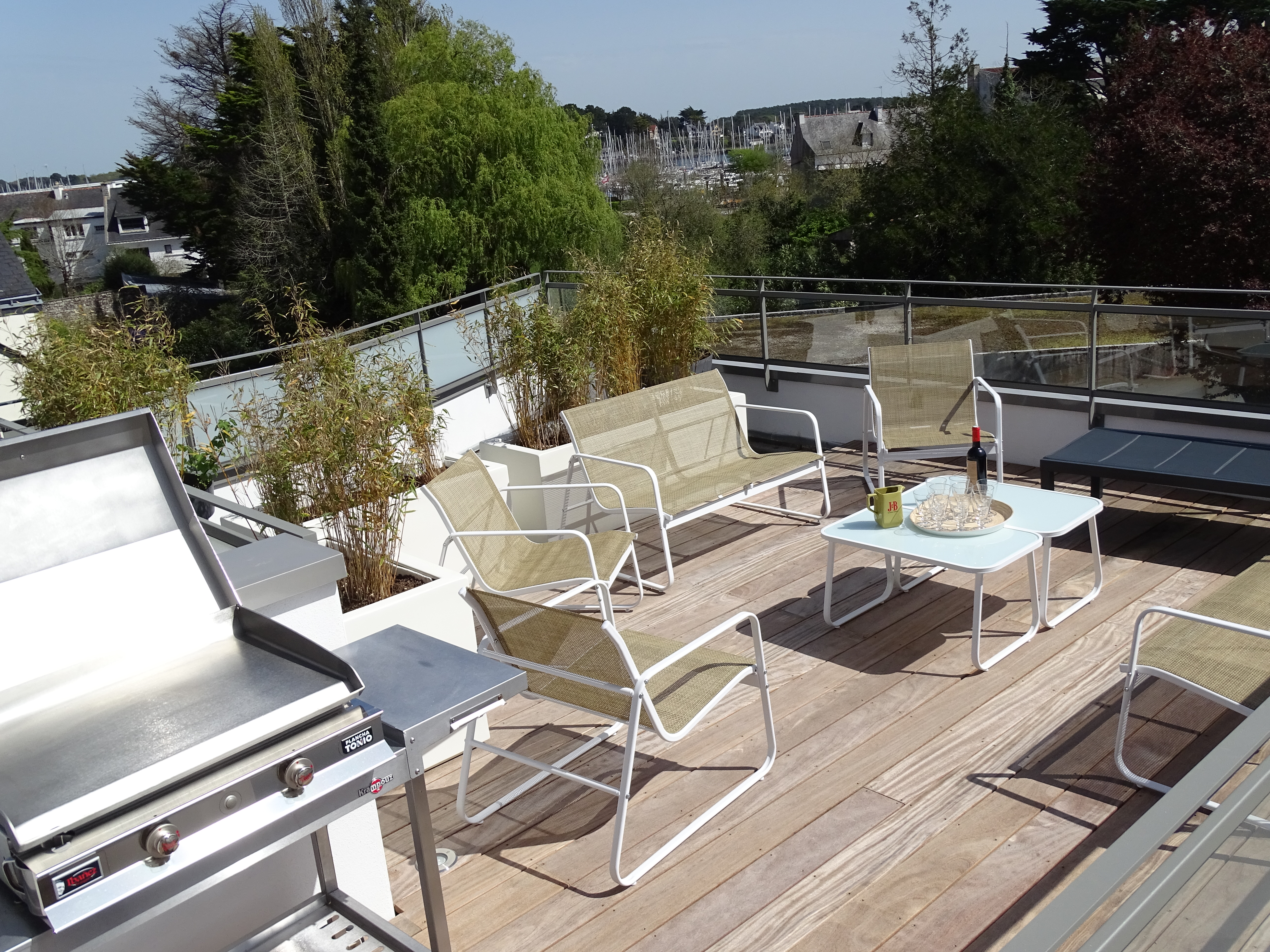 Terrasse bois avec vue dégagée, équipée d’un salon de jardin et d’une plancha inox haut de gamme.