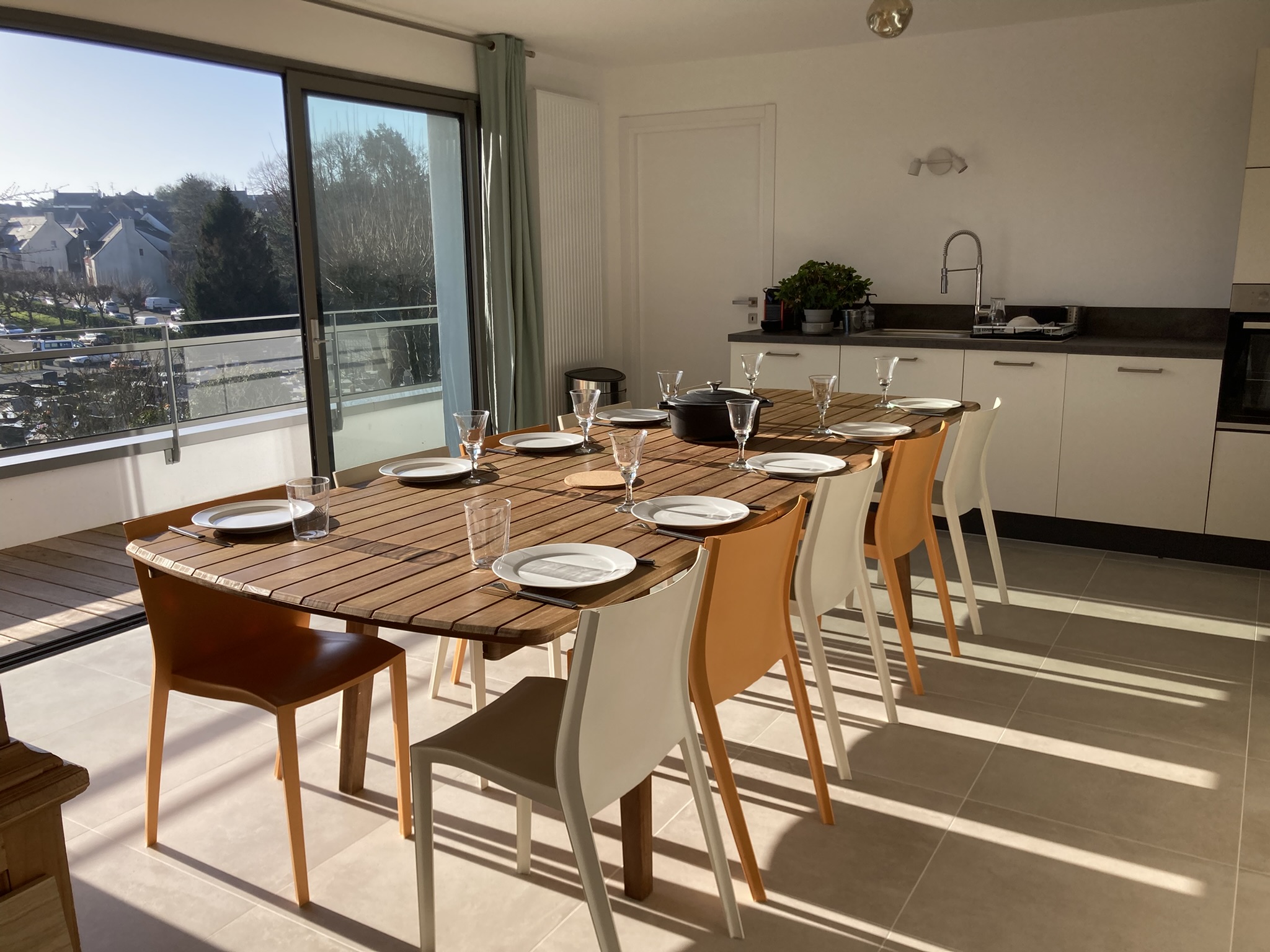La grande cuisine équipée peut accueillir jusqu’à 10 personnes et donne sur la terrasse (chaise haute pour bébé disponible).