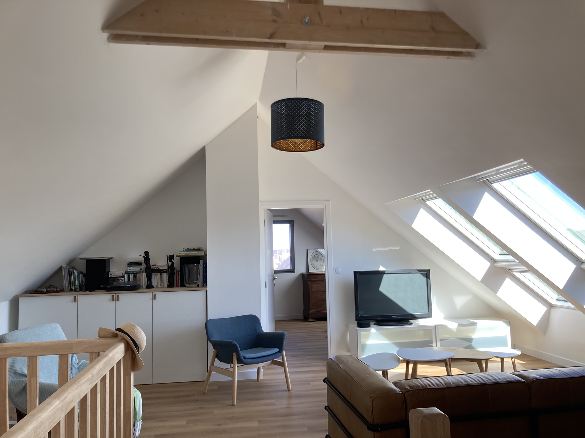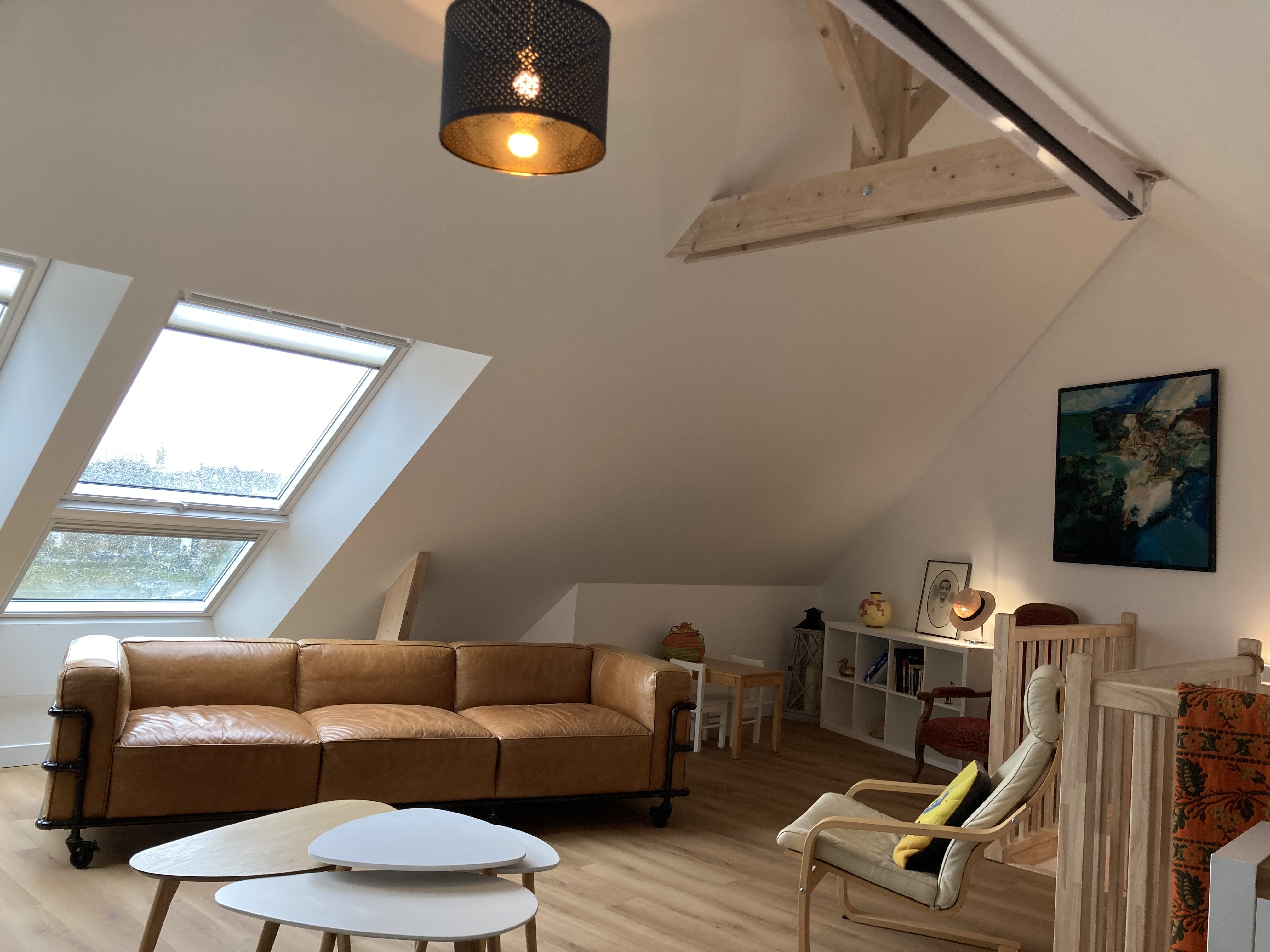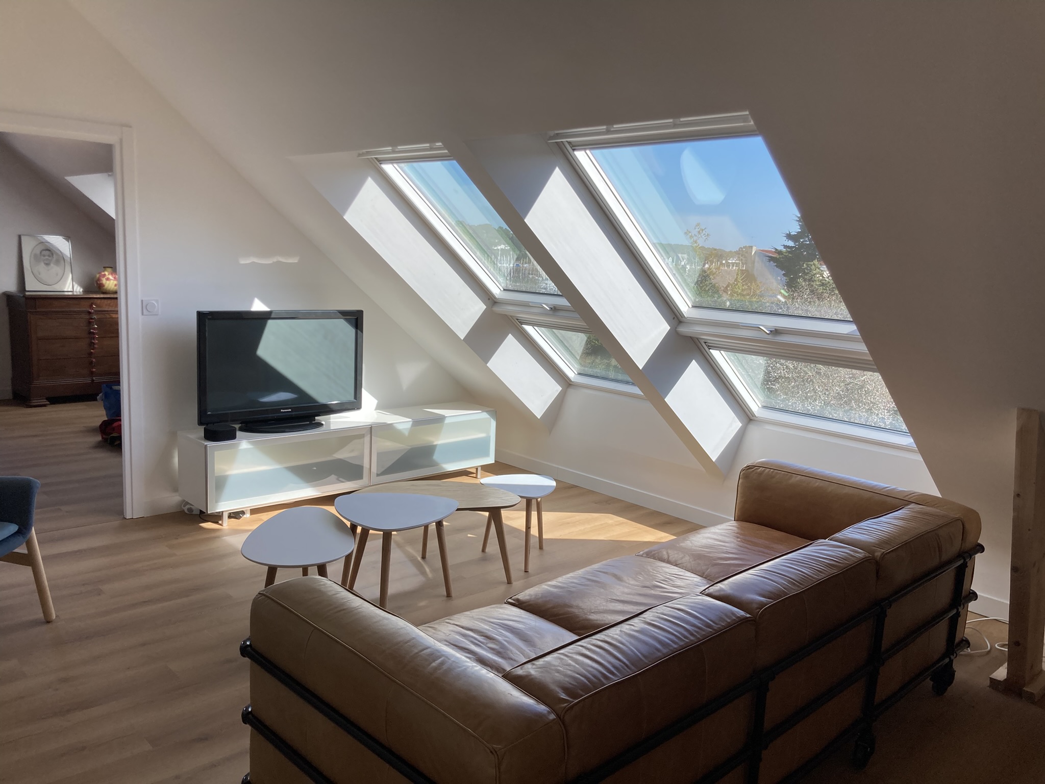 Vous disposez d’un grand salon cosy, canapé cuir XXL pour vous détendre. Livres, jeux et TV avec Canal+ et Netflix.